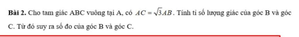 $\begin{array}{l} \tan B = \dfrac{{AC}}{{AB}} = \dfrac{{AB\sqrt 3 }}{{AB}} = \sqrt 3 \\ \Rightarrow B = {60^o} \end{array}$
