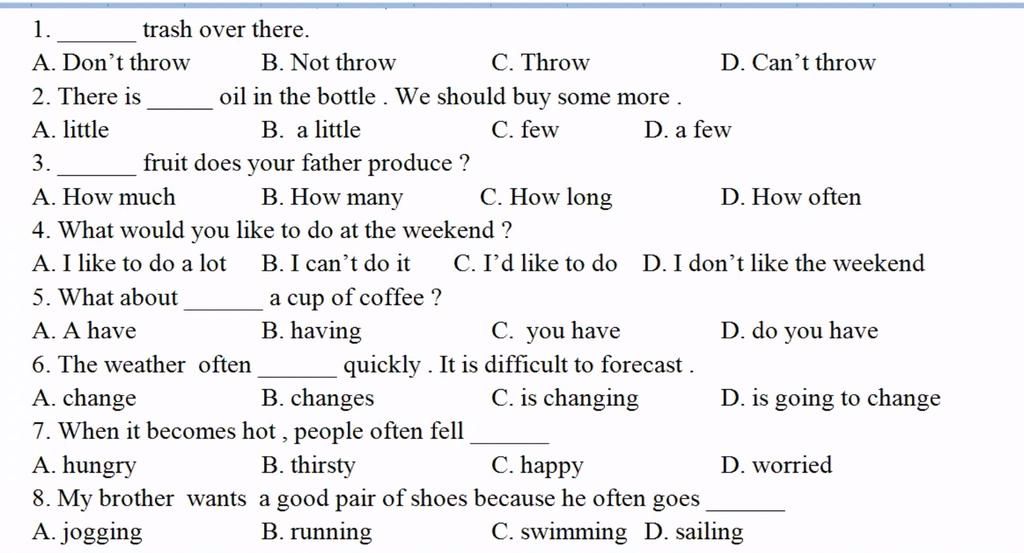 2. B. a little (oil ko đếm đc nên phải dùng a little)