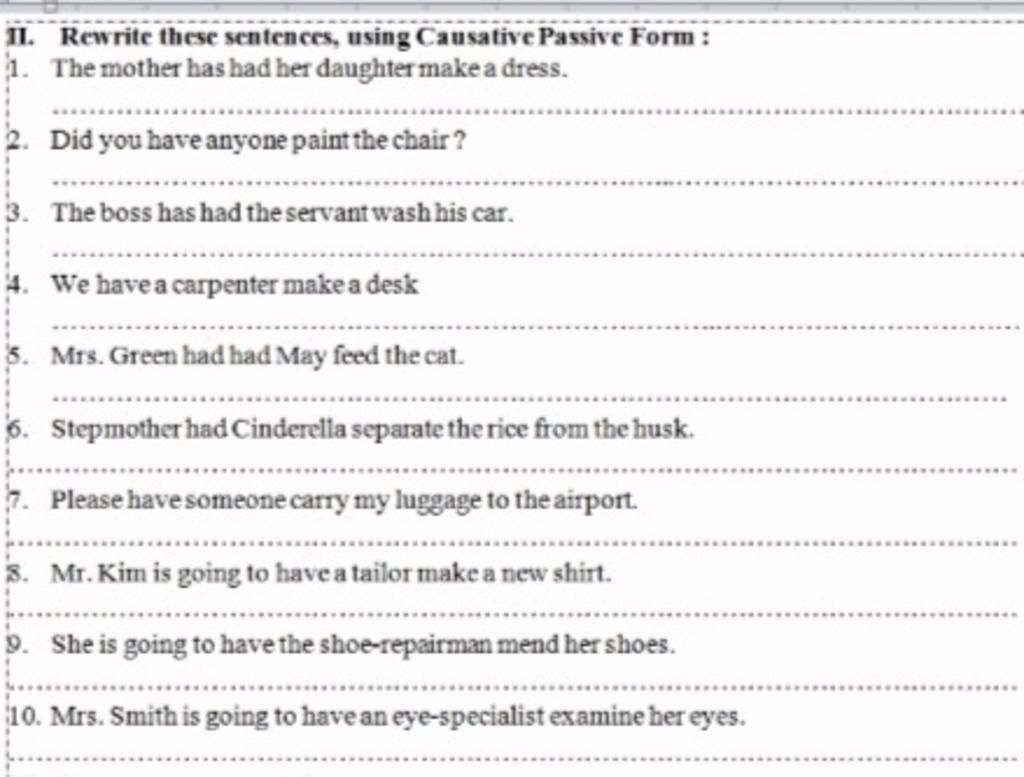 `text{9.}` She is going to have her shoes mended by the shoes-repairman.