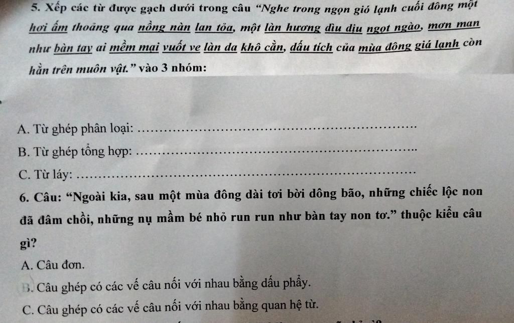 Trong câu '' Ngoài kia , sau một mùa đông dài tơi bời dông bão , những chiếc lộc non đã đâm chồi , những nụ mầm bé nhỏ run run như bàn tay non tơ . '' Thuộc kiểu câu : B .