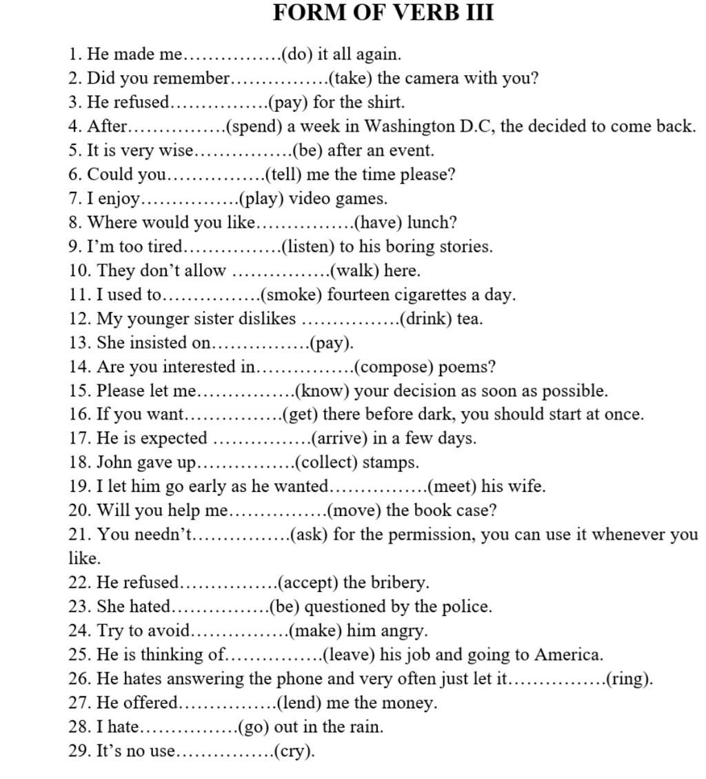 \(\text{1.do(make+sb+V-inf:khiến ai làm gì)}\\\text{23.being(câu bị động->hate+being+P2:ghét bị làm gì)}\\\text{Dạng bị động chung của các V mà sau nó là V-ing:avoid,hate,like,enjoy,love,...}\\\text{Chủ động:V+V-ing.}\\\text{Bị động:V+being+P2.}\)