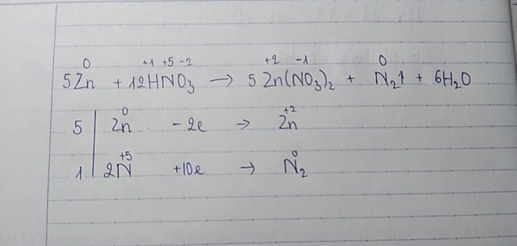 `=> 5Zn + 12HNO_3 \to 5Zn(NO_3)_2 + N_2 + 6H_2O `