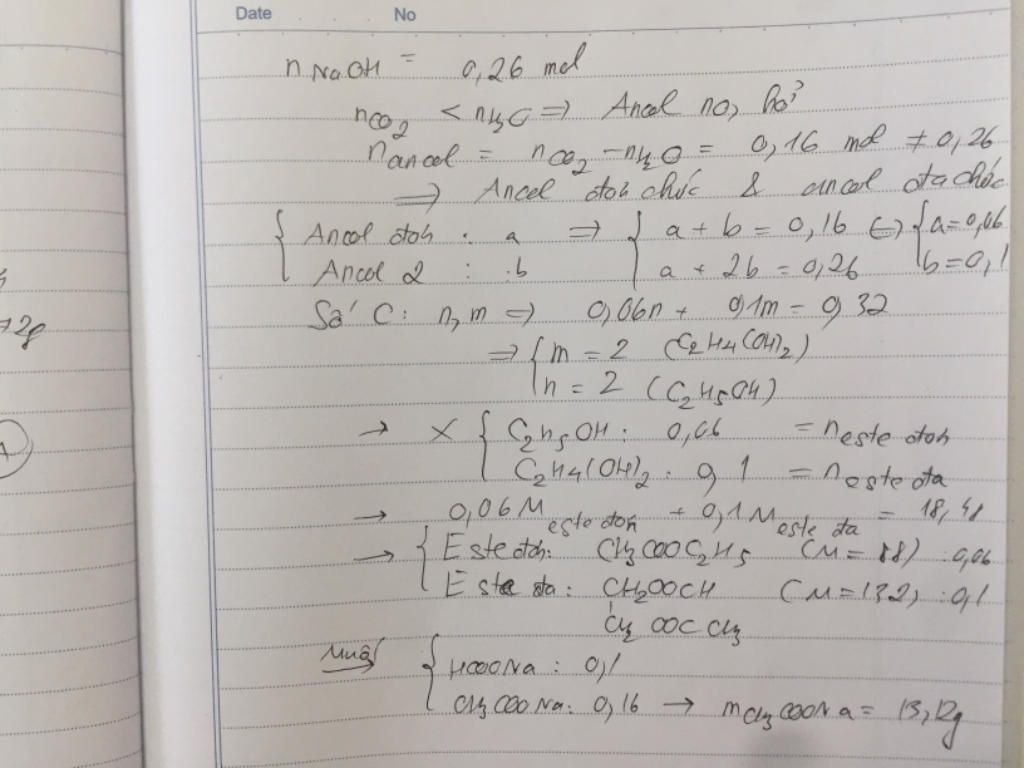 $ \Rightarrow {n_{este{\text{ don}}}} = {n_{{C_2}{H_5}OH}} = 0,06mol;{n_{este{\text{ da}}}} = {n_{{C_2}{H_4}{{(OH)}_2}}} = 0,1mol$