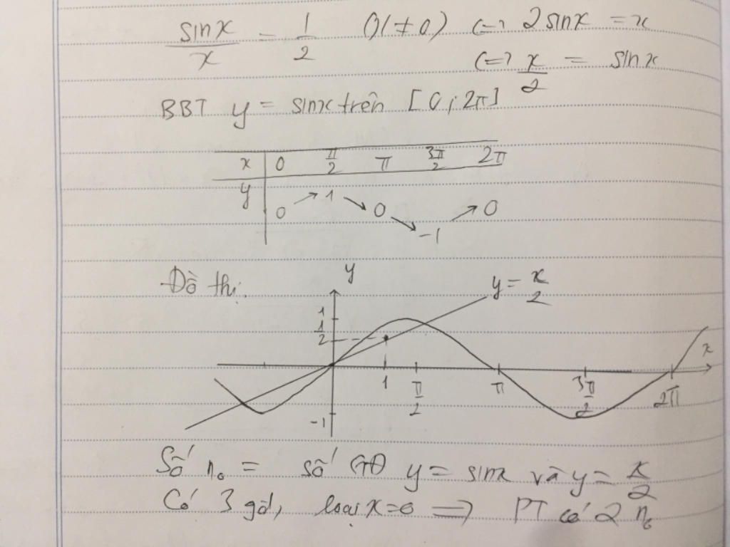 lời giải này là cho câu hỏi pt sinx/x=1/2 có bao nhiêu nghiệm hay là pt sinx/x=1/2 có bao nhiêu nghiệm trên đoạn [0;2pi] ạ?