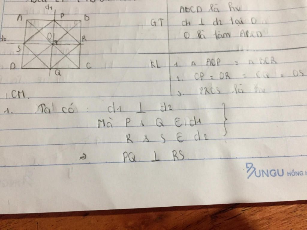 Cho hình vuông ABCD. 2 đường thẳng d1 và d2 vuông góc với nhau ở tâm O của hình vuông . Đường thẳng d1 cắt AB, CD kẻ P và Q. Đường thẳng d2 cắt BC, AD ở R và S. Chứng minh