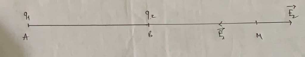 ta thấy độ lớn q1>q2 ---> M thuộc đoạn AB và nằm ngoài AB gần B hơn nên ta có hệ :
