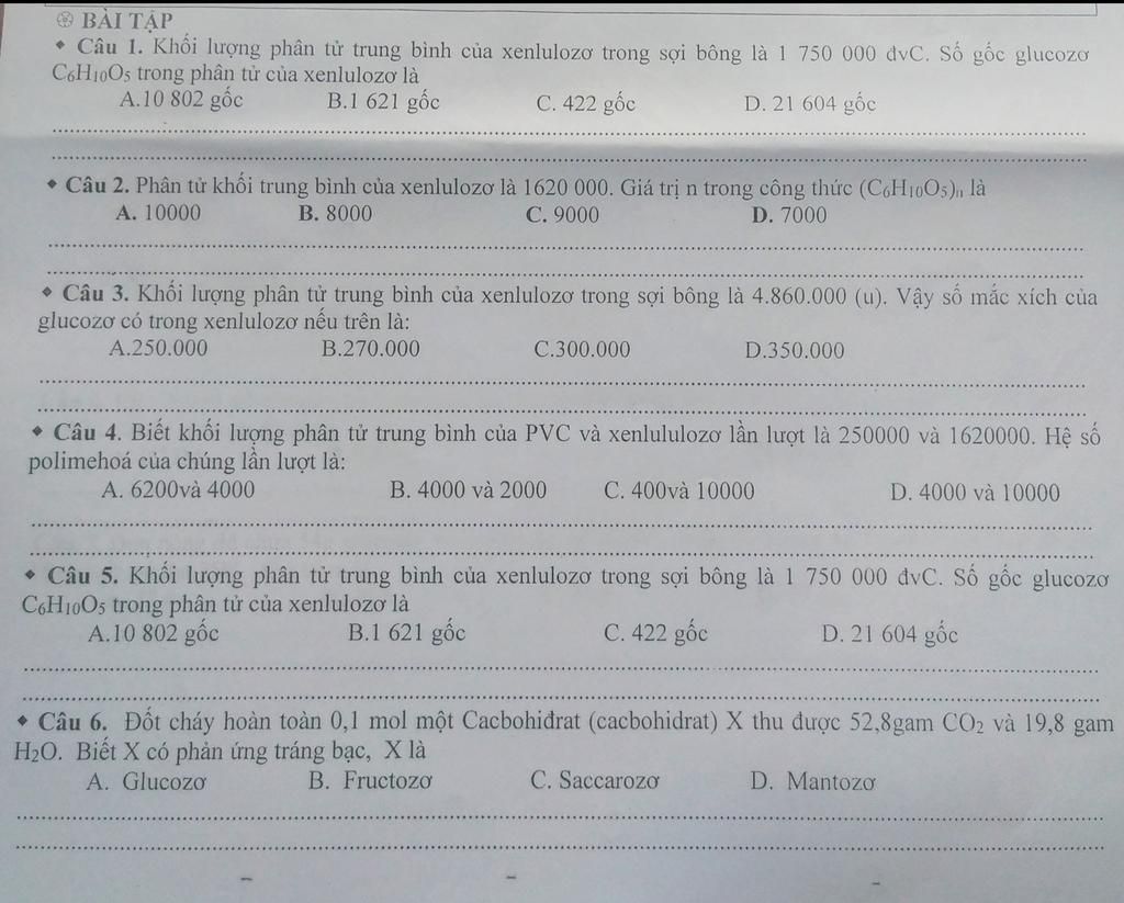 • Câu 2. Phân tử khối trung bình của xenlulozo là 1620 000. Giá trị n trong công thức ...