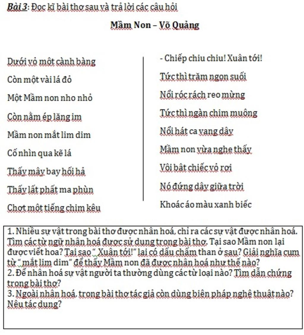 1. Những sự vật được nhân hóa là: Mầm non, chú chim, ngọn suối.