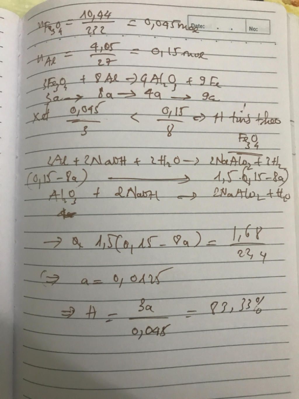 Trộn 10,44 gam Fe3O4 và 4,05 gam bột Al rồi tiến hành phản ứng nhiệt nhôm trong điều kiện không có không khí, sau khi phản ứng kết thúc lấy chất rắn thu được cho tác dụng với dung dich NaOH dư thấy thoát ra 1,68 lít khí ở đktc . Tính hiệu suất của quá trình nhiệt nhôm.
