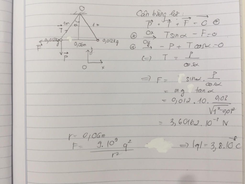 Hai quả cầu nhỏ có cùng khối lượng m = 1,2g ; cùng điện tích q,được treo trong không khí vào cùng một thời điểm O bằng hai sởi dây mảnh,nhẹ ( khối lượng không đáng kể ) cách điện ,không co dãn ,và có cùng chiều dài L = 1 m .Do lực đẩy tích điện chúng cách nhau một khoảng r = 6 cm , khoảng này rất nhỏ so với chiều dài dây treo ( r << L ) lấy g = 10 m/s .Độ lớn điện tích của mỗi quả cầu là .
