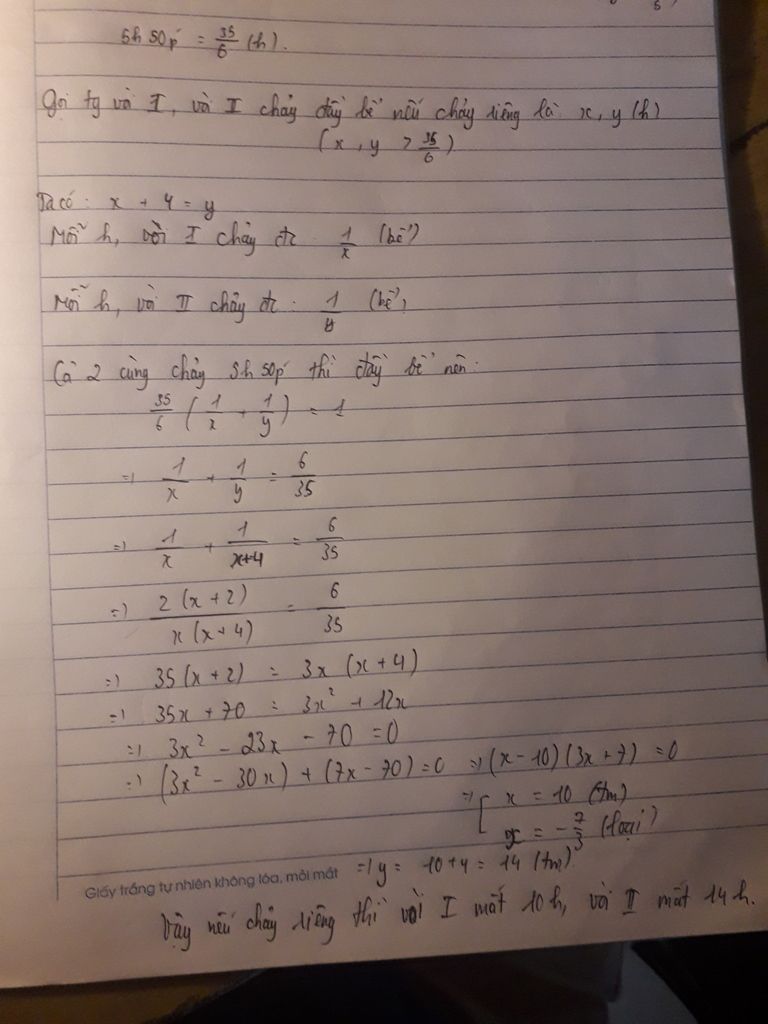 Đổi 5h50p thành 35/6h, Vì cả 2 cùng làm chung trong thời gian đó là 35/6h thì hoàn thnahf công việc, công việc là 100% hay bằng 1 thì sẽ bằng tg làm việc nhân vs tổng năng suất mà cả 2 cùng làm trong 1h