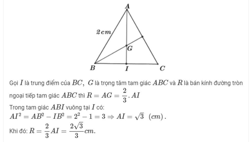 Khi đó R = $\frac{2}{3}$ AI = $\frac{2\sqrt{3}}{3}$ (cm)