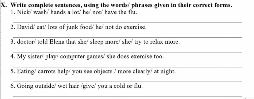 X. Write complete sentences, using the words/ phrases given in their correct forms.