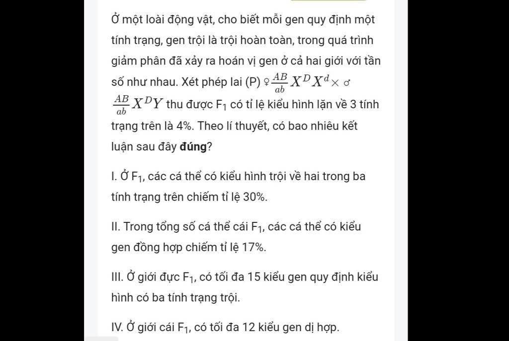 IV. Ở giới cái $F_{1}$, có tối đa 12 kiểu gen dị hợp → Đúng.