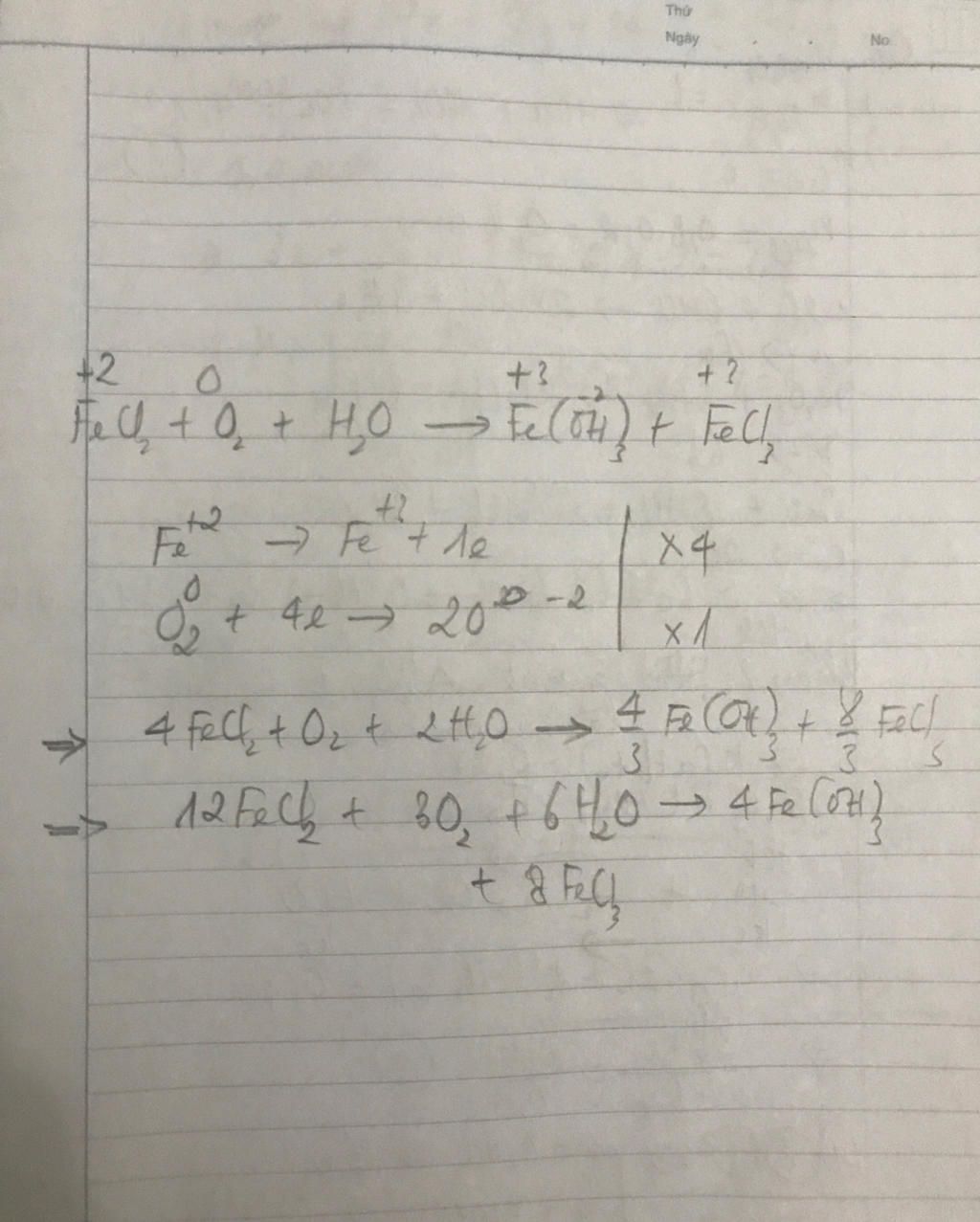 \(4FeC{l_2} + {O_2} + 2{H_2}O\xrightarrow{{}}\frac{4}{3}Fe{(OH)_3} + \frac{8}{3}FeC{l_3}\)