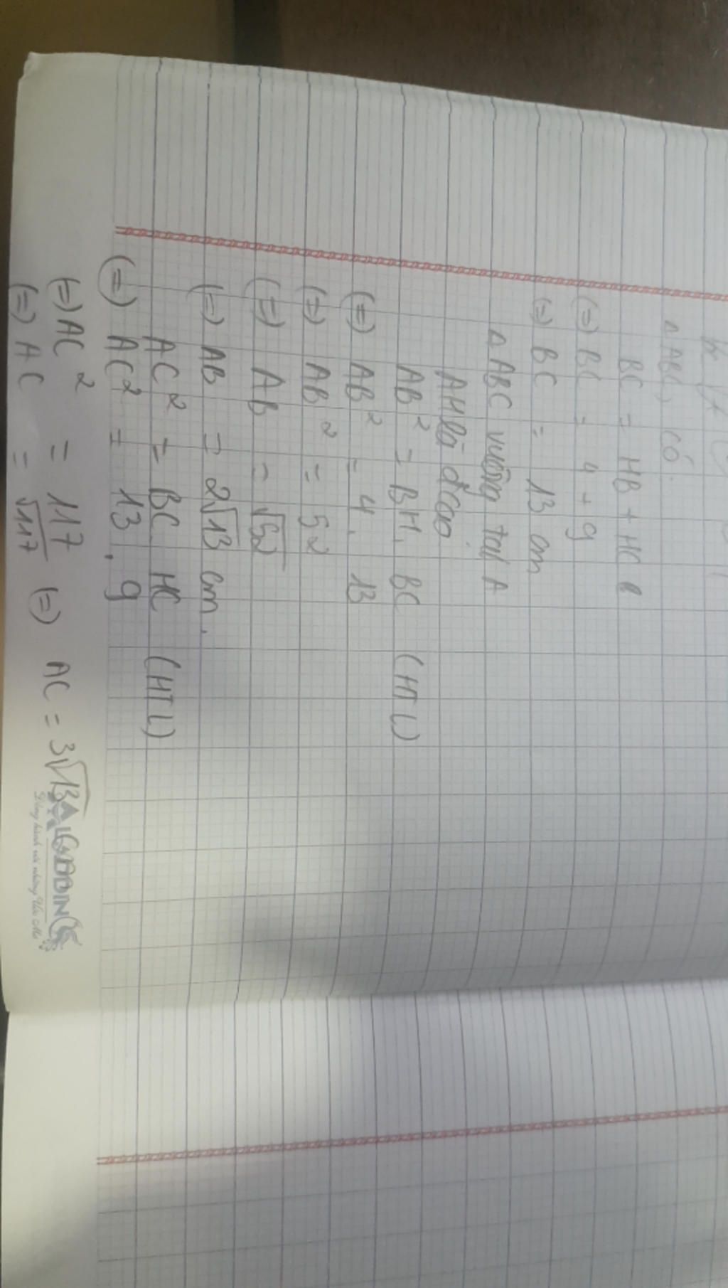 `***` Giả sử `ΔABC` vuông tại `A` đường cao `AH` ứng với cạnh huyền `BC` chia cạnh huyền thành hai cạnh có độ dài: `BH=4cm;CH=9cm`