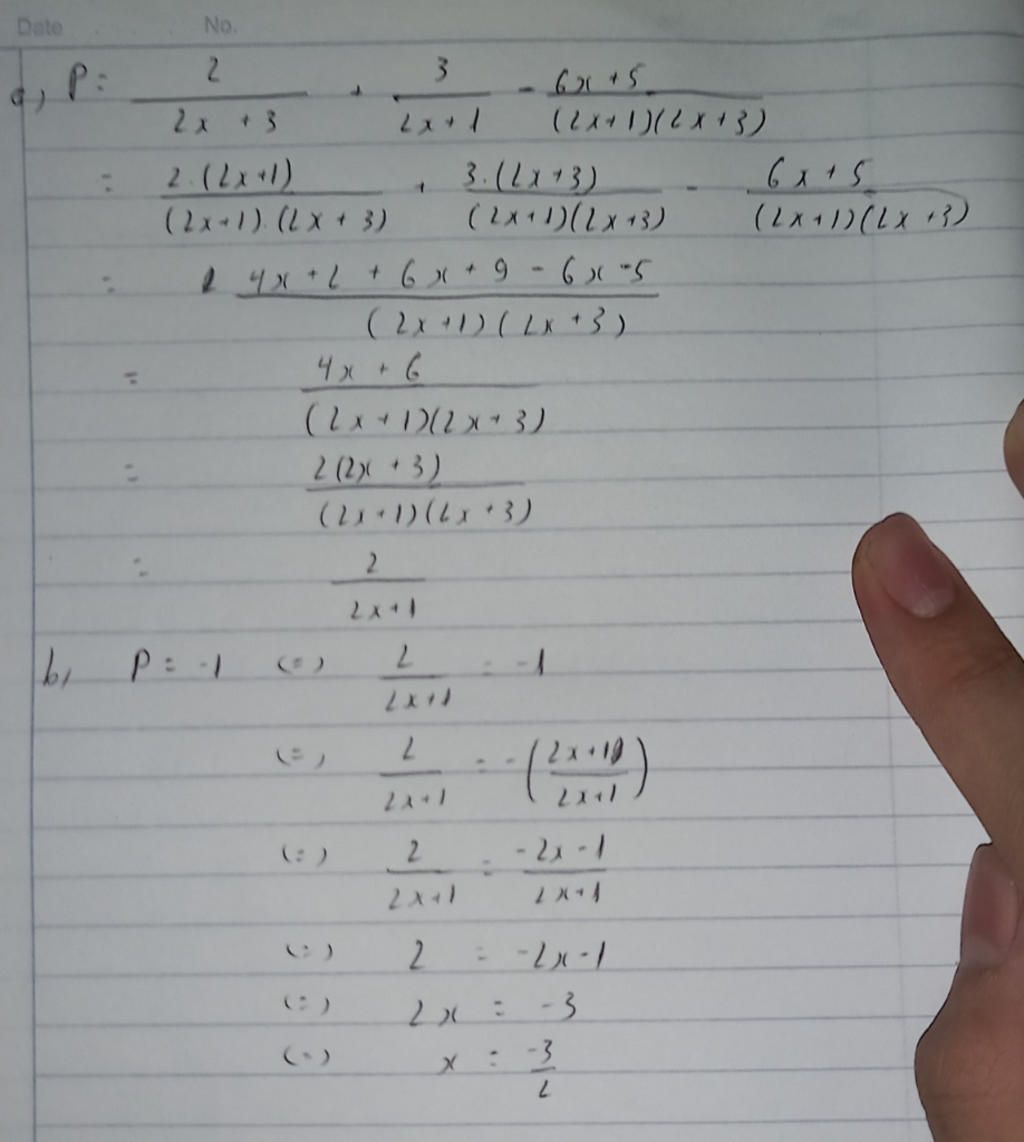 `P=(2)/(2x+3)+(3)/(2x+1)-(6x+5)/((2x+1)(2x+3))`