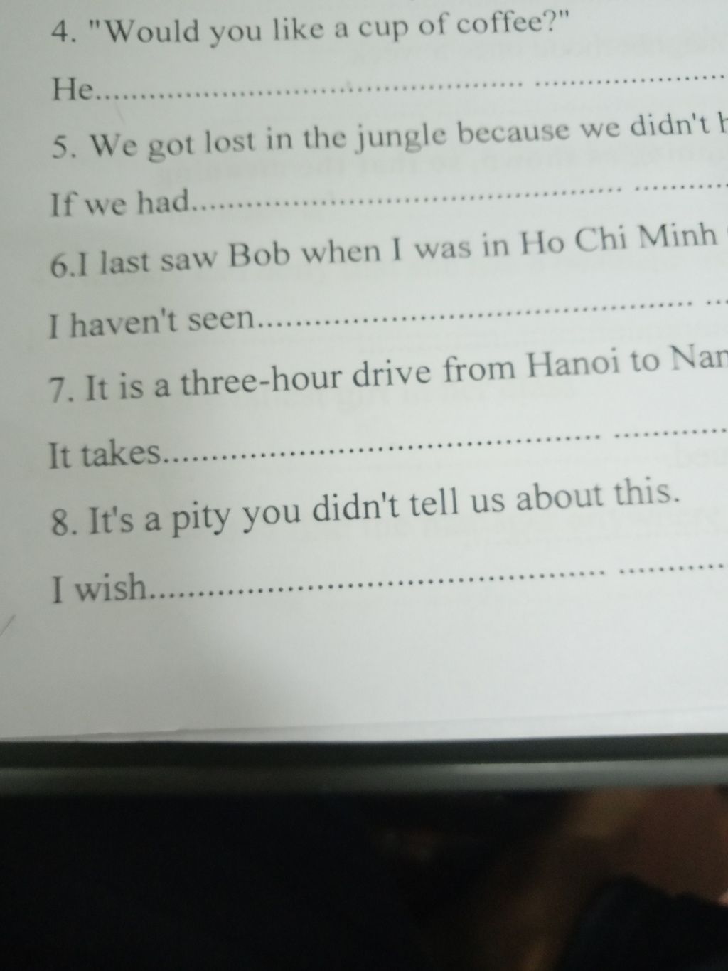 4. He invites me to drink a cup of coffee He offers me with a cup of coffee. 5. If we had + V3, we wouldn't have lost in the jungle 6. I haven't seen Bob since i left HCM 7. It takes O + time + to v 8. I wish you had told us about this