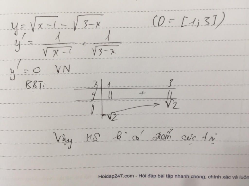 `y'=\frac{1}{2sqrt(x-1)}+\frac{1}{2sqrt(3-x)}>0∀x∈[1;3]`