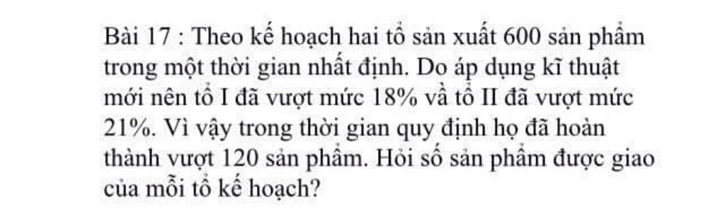 Do áp dụng kĩ thuật mới nên tổ I vượt mữa 18% và tổ hai vược mức 21%, vì vậy họ đã hoàn thành vượt 120 sản phẩm nên ta có: