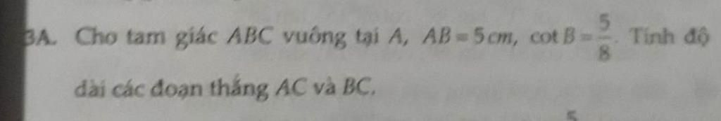 $\cot \widehat{B}=\dfrac{AB}{AC}=\dfrac{5}{8}\\ \Rightarrow AC=8cm$