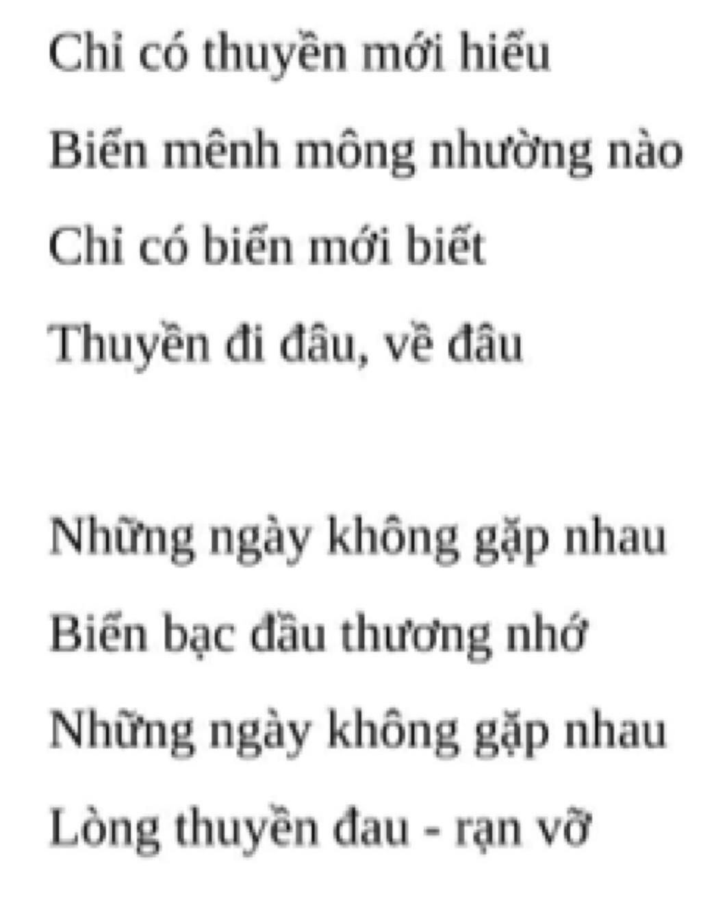 Mượn hình ảnh thuyền, biển, hai khổ thơ trở thành lời nhắn gửi yêu thương của tác giả. Đó là sự khẳng định về một tấm lòng yêu vói bao nhớ thương, chung thủy, bao dung. Nỗi nhớ và tình yêu vượt lên muôn ngàn cách trở và khó khăn ở đời để rồi hướng tới một hi vọng về ngày mai tươi sáng cho tình cảm của con người. Không gặp, không được ở bên lòng người đau đáu và buồn bã. Tình cảm con người được đặt trong sóng gió muôn trùng và thử thách. Nhưng có lẽ càng qua thử thách thì tình cảm càng gắn kết, càng được khẳng định và trở nên bền chặt.