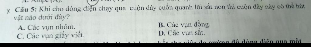- Khi dòng điện chạy qua cuộn dây cuốn quanh lõi sắt non thì cuộn dây có thể hút được các vụn sắt vì khi dòng điện chạy qua cuộn dây cuốn quanh lõi sắt non thì nhờ tác dụng từ của nguồn điện thì lỗi sắt non đó có thể hút được một số loại kim loại trong đó có sắt, lõi sắt non đó không hút được đồng và nhôm vì sự sắp xếp các nguyên tử của đồng và nhôm làm cho từ trường của các electron cấu tạo nên nó tự triệt tiêu lẫn nhau nên không bị lõi sắt non đó hút, còn sắt thì cấu trúc nguyên tử của nó làm cho từ trường của các electron cấu thành nên nên nó cộng dồn với nhau nên bị lõi sắt non đó hút