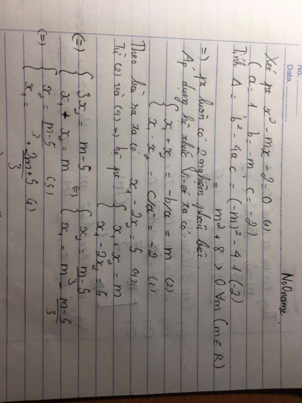 \(\begin{cases}x_1+x_2=m\ (1)\\x_1 x_2=-2\ (2)\end{cases}\)