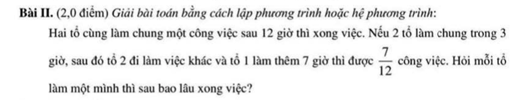 Nếu 2 tổ làm trong 3h sau đó tổ II đi làm việc khác và tổ I làm thêm 7h thì được $\dfrac7{12}$ công việc nên
