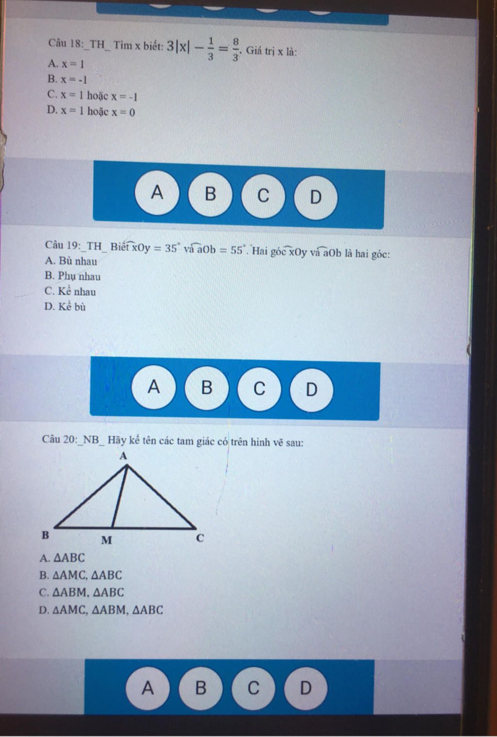 $\text{Những $\triangle$ có trong hình vẽ là:}$ $\begin{cases} Δ ABM\\Δ AMC\\Δ ABC \end{cases}$