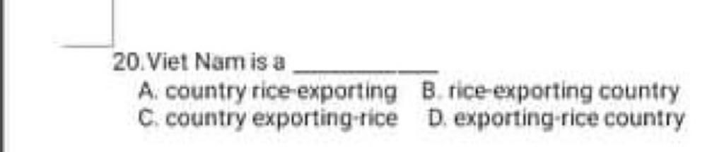 Loại A,C vì danh từ"country" có mạo từ"a"đằng trước,vì vậy nếu đúng đáp án phải là"a country which export rice"(bỏ dấu gạch nối)