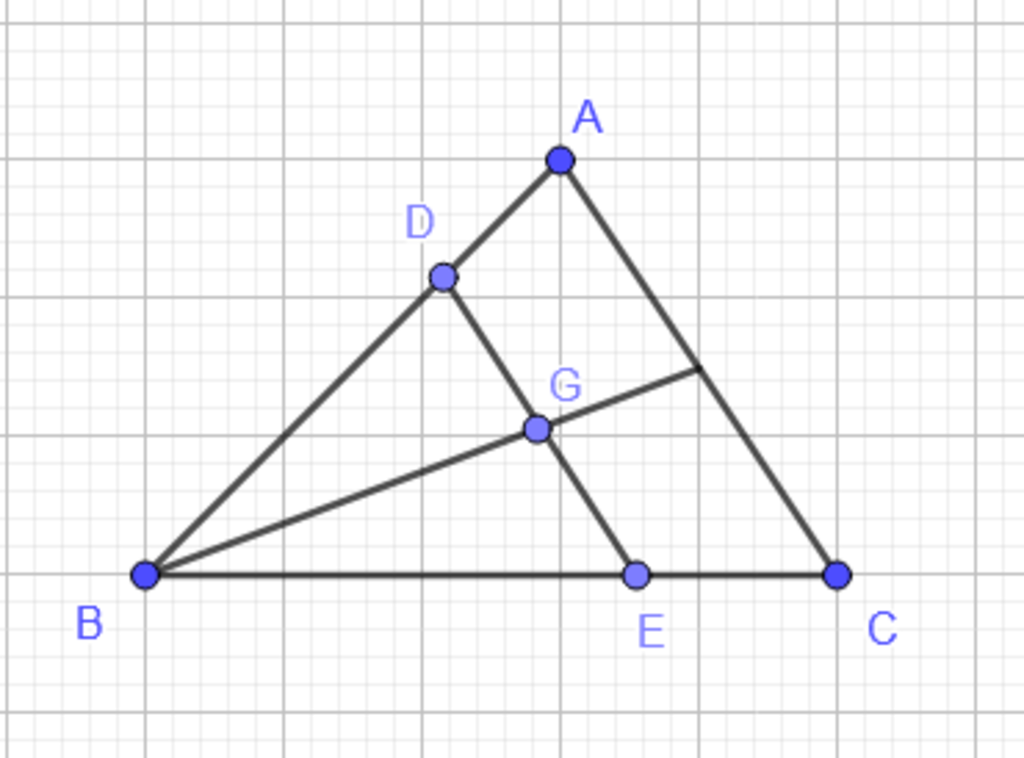 @ximuoi32629 Gọi BG giao AC tại F Vì G là trọng tâm tam giác ABC=> GF/BF=1/3 Mà DE//AC Nên GF/BF=CE/BC=1/3(Định lý talet) Ta có: AD/AB=CE/CB(Định lý talet) => AD/AB=CE/CB=1/3(Tính chất bắc cầu)