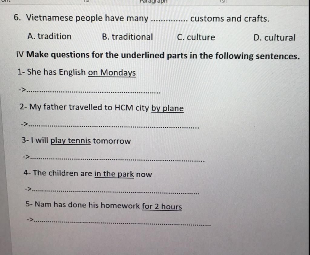 5. How long has Nam done his homework? - Phần gạch nói về 1 khoảng thời gian, chọn how long