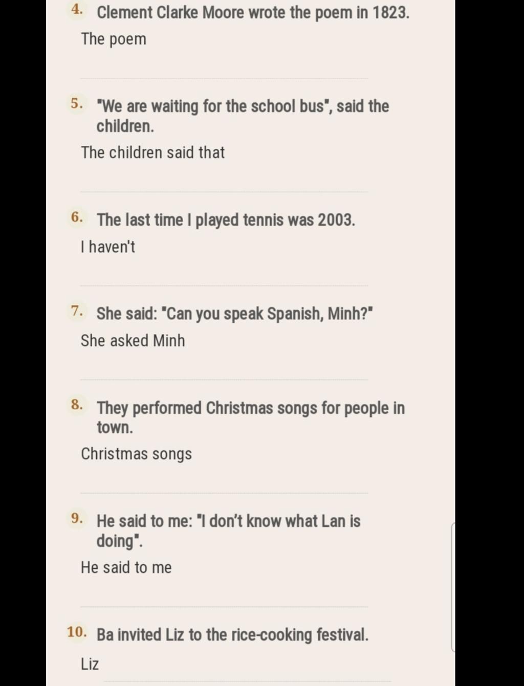7. She asked Minh if he could speak Spanish. (câu tường thuật, can -> could)
