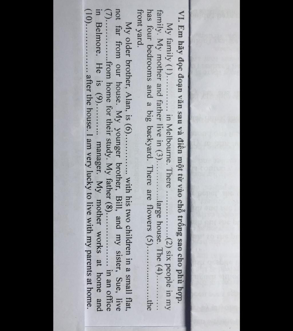VI. Em hãy đọc đoạn văn sau và điền một từ vào chỗ trông sao cho phù hợp.