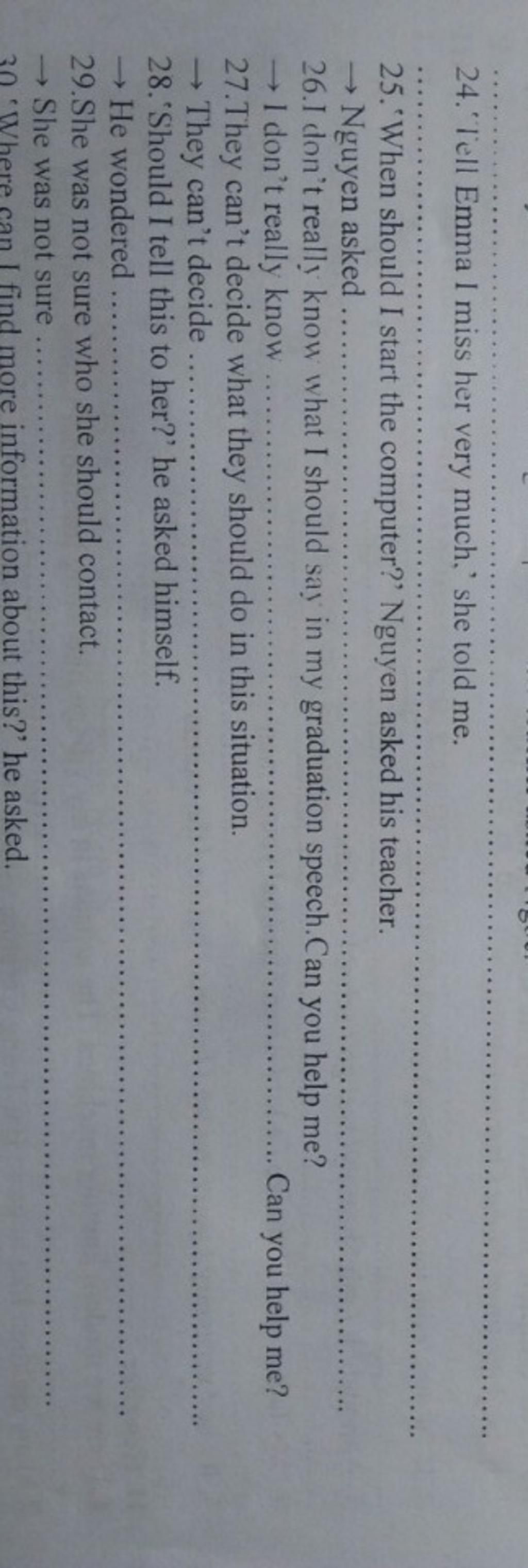 `24`. She told me to tell Emma she missed her very much. ( told sb to V: bảo ai đó làm gì )