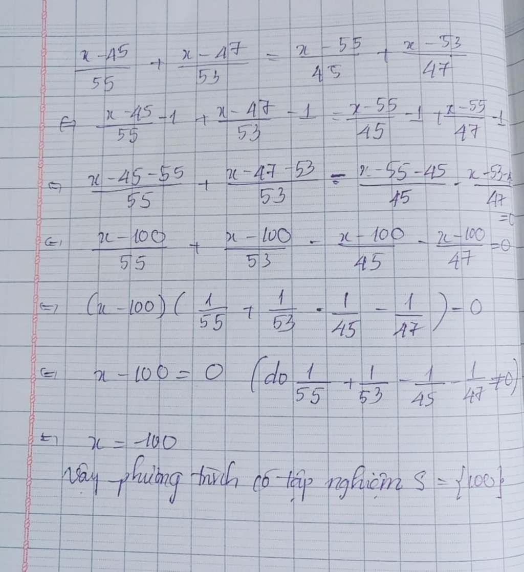 $⇔x-100=0 (vi: \frac{1}{55}+$ $\frac{1}{53}-$ $\frac{1}{45}-$ $\frac{1}{47}$$\neq0$