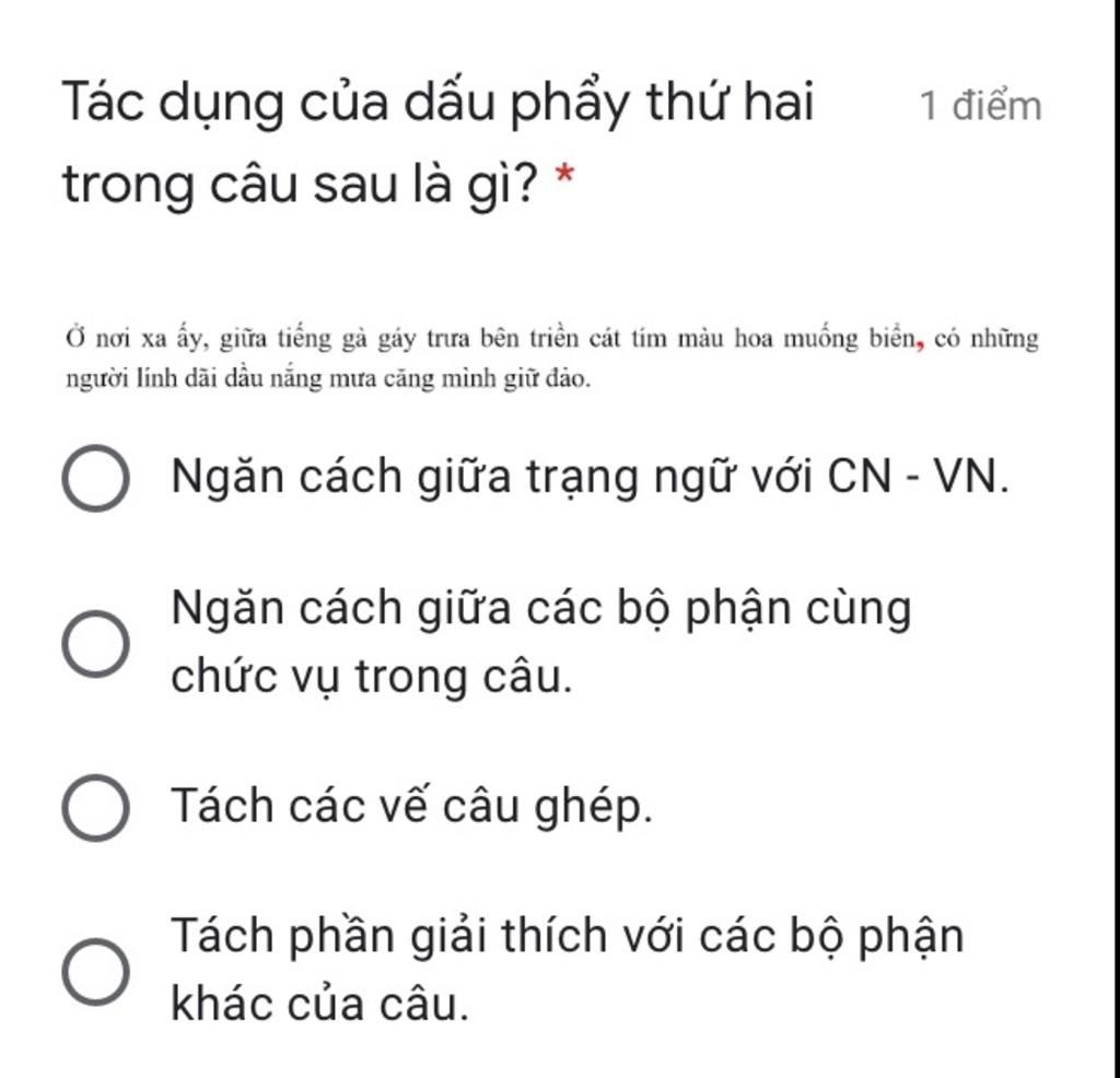 Ở nơi xa ấy, giữa tiếng gà gáy trưa bên triền cát tím màu hoa muống biển (câu ghép thứ nhất)