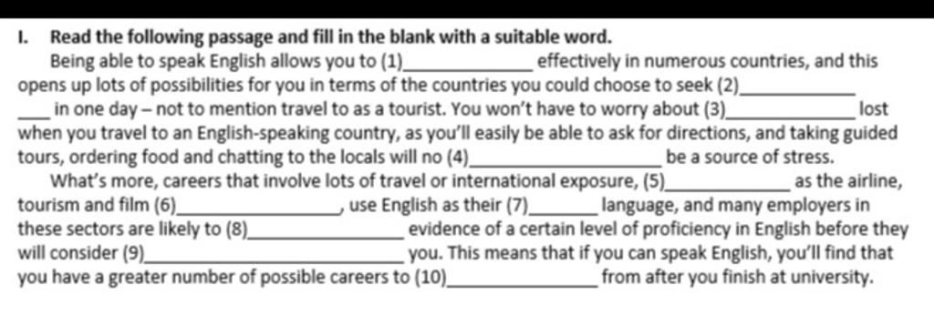 1. communicate hoặc work. ở đây sẽ cần dùng một động từ ta có thể dùng 2 từ trên nhưng đọc cả đoạn dưới thì mình nghĩ ta dùng từ communicate sẽ phù hợp hơn. 2. employment/work. => mình nghĩ ở đây có từ seek là động từ vậy ta cần 1 danh từ đi sau nó . và 2 từ tgreen đều có thể sử dụng kết hợp lại sẽ là tìm kiếm việc làm. 3. getting. => đọc cả câu ta thấy phía dưới có đoạn "easily ........ ask for directions". có nghĩa là dễ dàng hỏi đường. vậy ở trên sẽ phải là ko lo bị lạc. Bị lạc là " get lost" nhưng phía trước là about nên get=>getting. 4. longer. => ở đây cần 1 từ kết hợp với từ "no" để có nghĩa " ko lo lắng" vì vậy ta dùng " no longer" 5. such . câu này có lẽ là dễ quá rồi mình ko cần giải thích nữa nha. 6. industry film industry; ngành công nghệp điện ảnh. 7. oficial. => ở đây ta cần sử dụng 1 tính từ mang nghĩa chủ yếu/ chính thức hoặc quan trọng. bạn có thể lựa chọn nhé . 8. require. => những người sử dụng nhân viên trong những lĩnh vực này thì có thể.......bằng chứng về mức độ thành thạo tiếng anh. Vậy ở đây càn 1 động từ mang ý nghĩa yêu cầu/ cần . nhưng mình thấy khi họ tuyển nhân viên thì nghĩa là yêu cầu phù hợp hơn.=> dùng require. 9. about. consider about : cân nhắc.. 10. Choose lựa chọn Rút gọn1. communicate hoặc work. ở đây sẽ cần dùng một động từ ta có thể dùng 2 từ trên nhưng đọc cả đoạn dưới thì mình nghĩ ta dùng từ communicate sẽ phù hợp hơn. 2. employment/work. => mình nghĩ ở đây có từ seek là động từ vậy ta cần 1 danh từ đi sau nó . v... xem thêm