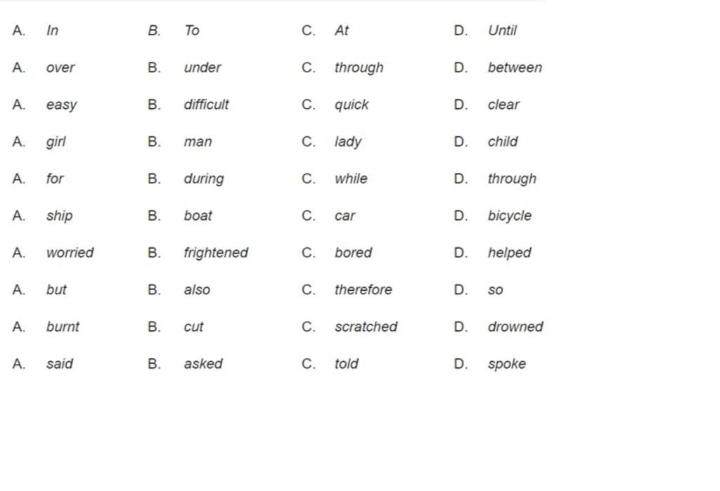…(1)... six o’clock yesterday evening, the River Thames burst its banks and flooded a wide area. By nine o’clock the floods had reached the town of Dorchester. The main street was soon ...(2).... 3 feet of water. Fire engines arrived quickly to pump away the water, but heavy rain made their job very…(3)..... .Mrs Rose Willow, a … (4).... nearly 80 years old, and living alone in her cottage, was trapped upstairs… (5)...... three hours. Finally, firemen were able to rescue her with ladders and a small… (6)........ “My cat, Tibbles, stayed with me all the time”, said Mrs Willow. “She… (7)..... me a lot. She sat with me so I didn’t feel afraid”. The rain has finally stopped, the river level is falling and the weather forecast is good, … (8) .....the floods have done a great deal of damage. “Luckily, nobody was…(9)...or injured”, Chief Fire Office Hawkins… (10) ....reporters, “but it will take a long time to clear up the mess”.