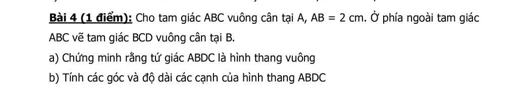 Từ `(1), (2) => \hat{ABC}=\hat{BCD}(=45^o)`