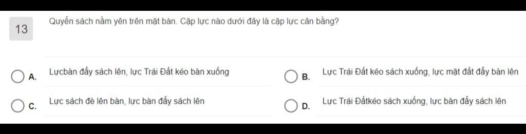 Quyển sách nằm yên trên mặt bàn.Cặp lực nào dưới đây là cặp lực cân bằng: