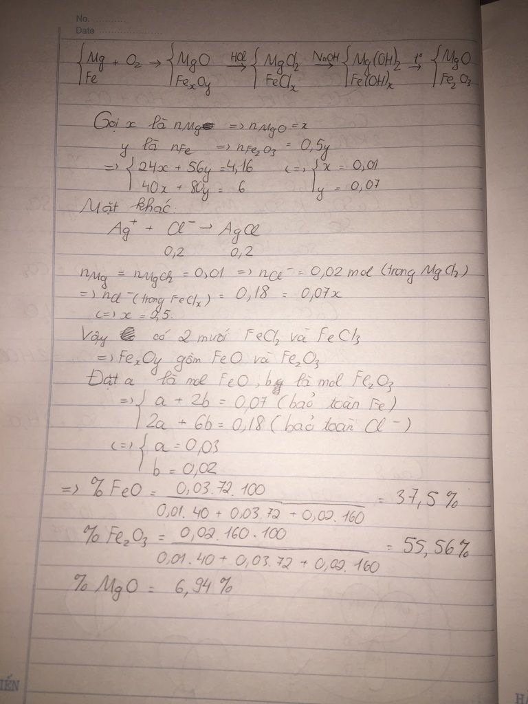 Đốt cháy 4,16g hh Mg và Fe trong khí O2, thu được m gam hh A chỉ gồm 3 oxit.Hòa tan hoàn toàn A trong dd HCl vừa đủ thu được dd B.Cho từ từ dd NaOH dư vào dd B thu được kết tủa C.Nung C trong không khí đến khối lượng không đổi, thu được 6g chất rắn.Mặt khác cho B tác dụng với dd AgNO3 dư thu được 32,65g chất rắn.Xác định thành phần phần trăm về khối lượng các oxit trong A