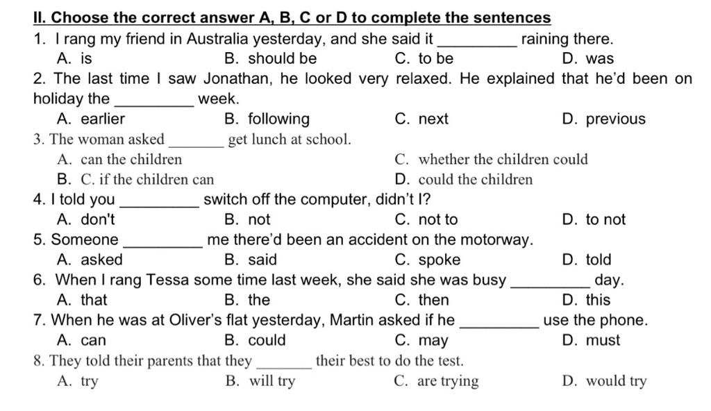II. Choose the correct answer A, B, C or D to complete the sentences