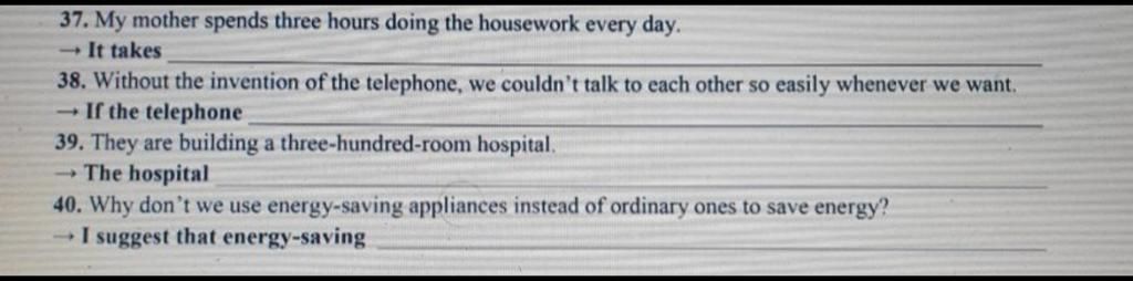 $\text{37 It takes my mother three hours to do the housework every day.}$