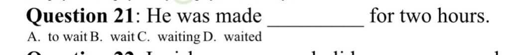 21 A→ sau cấu trúc của câu bị động +to V0( nguyên mẫu)