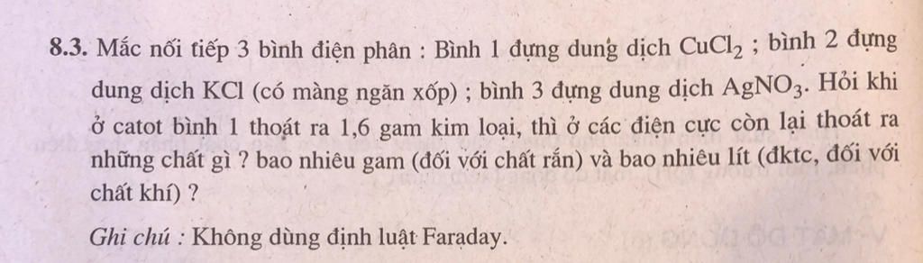 8.3. Mắc nối tiếp 3 bình điện phân : Bình 1 đựng dung dịch CuCl2 ; bình 2 đựng
