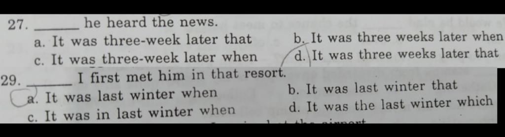27. D câu chẻ It is/was + thành phần nhấn mạnh (thời gian) + that S V