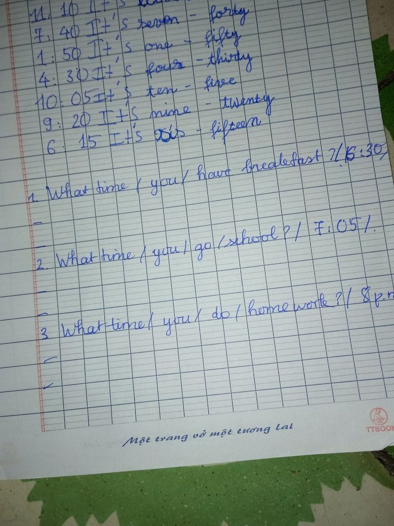 https://hoc24.vn/hoi-dap/tim-kiem?q=đặt+câu+hỏi+với+%27+what+time+%27+và+viết+câu+trả+lời+++ví+dụ+:+you/get+up/5.50++1.+you/brush/teeth/6.10++2.you/go/school/6.30++Nam/get+up/5.45++you/have+breakfast/6.15++Ba/+have+breakfast/6.20++you+father/+have+breakfast/6.45&id=458939 Rút gọnhttps://hoc24.vn/hoi-dap/tim-kiem?q=đặt+câu+hỏi+với+%27+what+time+%27+và+viết+câu+trả+lời+++ví+dụ+:+you/get+up/5.50++1.+you/brush/teeth/6.10++2.you/go/school/6.30++Nam/get+up/5.45++you/have+breakfast/6.15++Ba/+have+breakfast/6.20++you+father/+have+brea... xem thêm