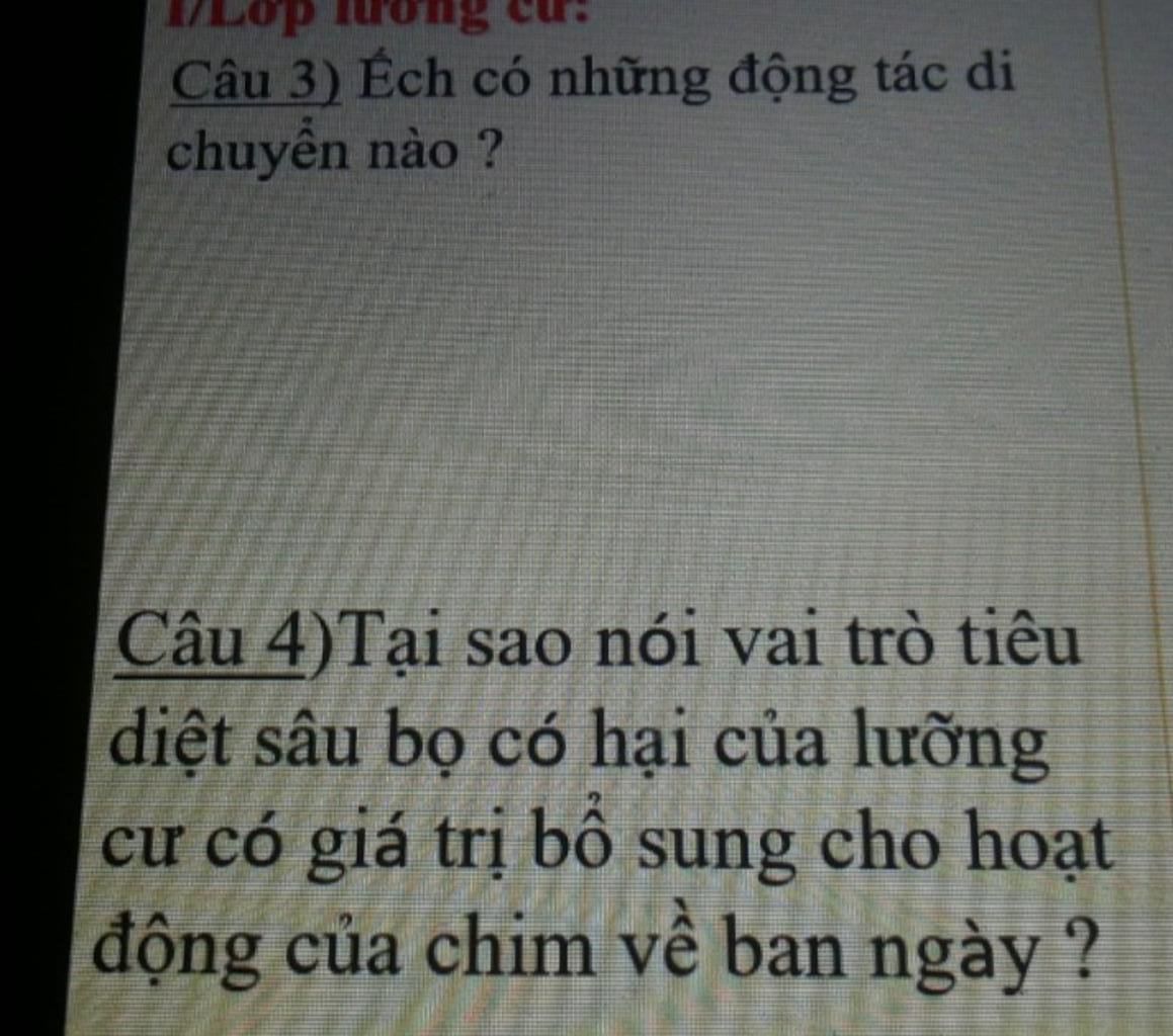 Câu 4.Đa số các loài chim thường đi kiếm mồi vào ban ngày nhưng loài lưỡng cư không đuôi(Amphibia) lại đi kiếm ăn vào ban đêm. Thức ăn chủ yếu của loài động vật này là côn trùng, giun đất, giáp xác,....Vì vậy tiêu diệt được một số lượng lớn sâu bọ, bổ sung cho hoạt động của chim về ban ngày.